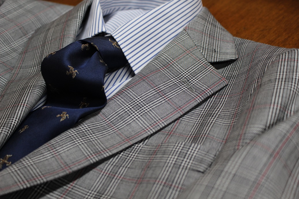 グレンチェック×オーバーペーン。最近流行りの柄行きも、英国高級生地が織り上げますと、こんなにも高級感が。上手く着こなすにはシンプルなコーディネート(無地シャツにソリッドタイ)が一番。ですが。柄に柄を合わせるというハイセンスな着こなしもお勧めだったりして(写真参考)。皆様も是非挑戦されてみてはいかがでしょうか。