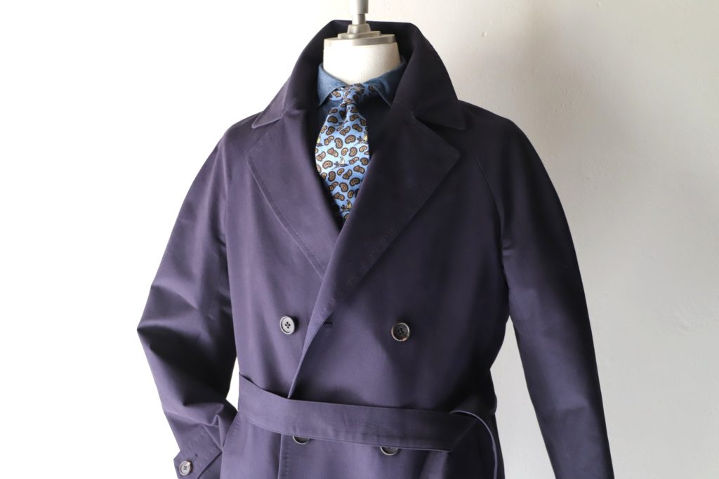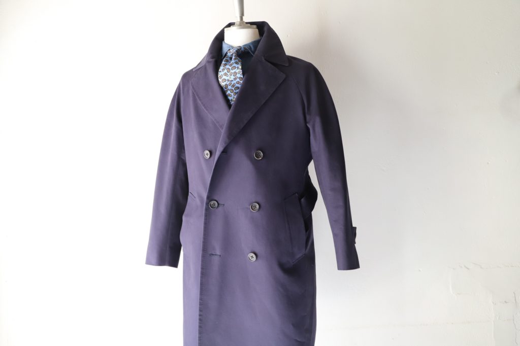 本日は英国コットンの代名詞、ブリスベンモスの服地を使った、ベルテッドコートのご紹介。今回はダブル、ラグランスリーブにてオーダーいただきました。
