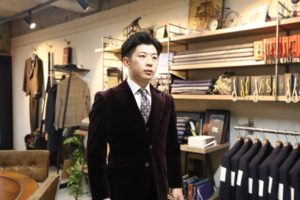 このお写真からでも伝わる重厚感。流石としか言いようがありません。ラペルの形や、幅、上衿の立ち具合、また背のインパーテッド、ベルトの太さなどなど、フルオーダーですので自由自在。細かく指定し、納得のいく一着に仕上がりましたヨ。