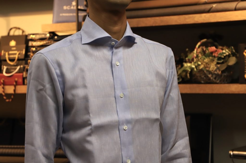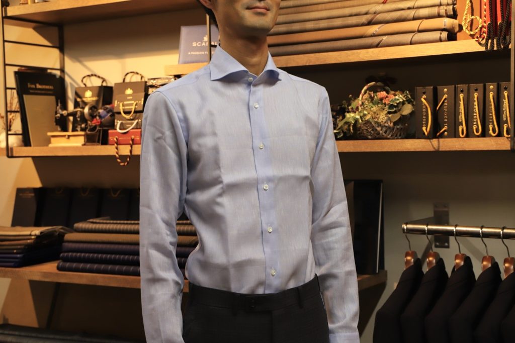本日のご紹介は、サックスブルーのリネンシャツ。ビジネス用にてオーダーいただきましたので、バスト、胴回りなどスッキリと仕上げました。カッタウェイの襟型で、ノーネクタイでも素敵に決まりますネ。