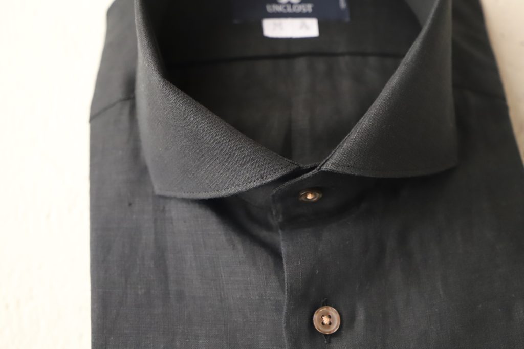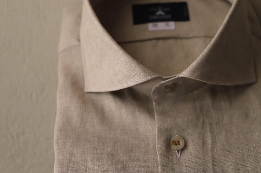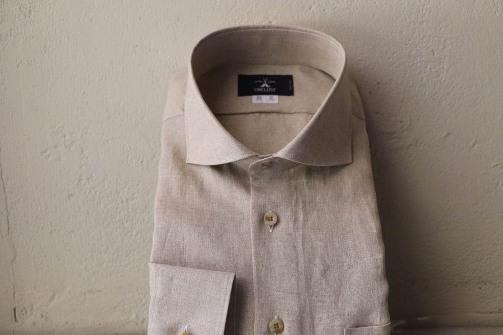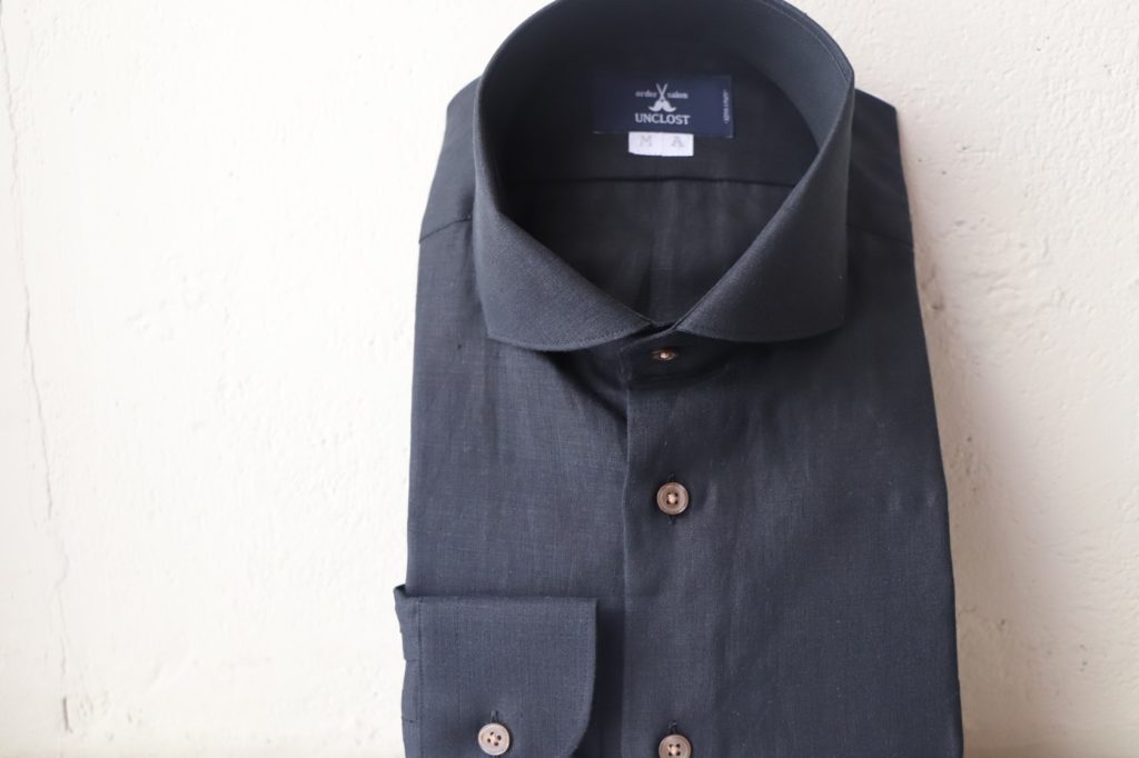さてさて、本日はそんな暑い夏にお勧めしたい、ピュアリネンのオーダーシャツをご紹介。サンドベージュ&ブラック。