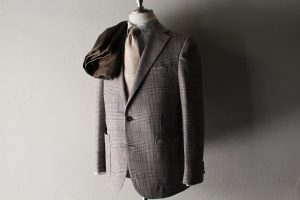 今回は、ピンホールカラーにてご注文いただきました。さすがフルオーダー、ピンを指した際の、襟のロールが美しい。生地は英国高級ファブリックメーカー、トーマスメイソン。中でも今回は、防皺性に優れたジャーニーのコレクション。綿100%の肌触り風合いはそのままに。嬉しい機能付きですネ。