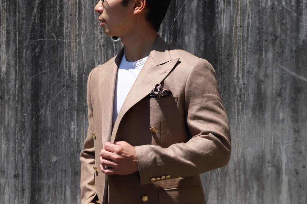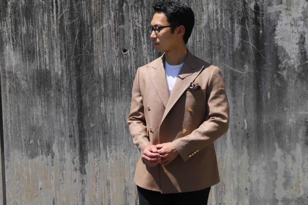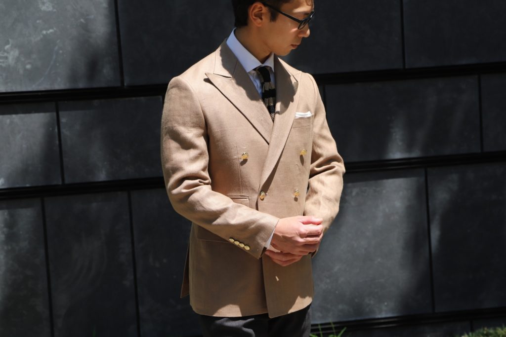 今回はダブルブレスト×ゴールドメタル。ブレザータイプでオーダー。敢えて肩パットや、毛芯をしっかり入れて、ブリティッシュな印象に仕上げました。写真上二枚はタイドアップ。下二枚はカジュアルに。オンオフ兼用でお使いいただけますヨ。