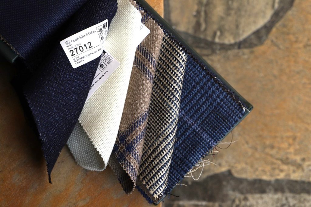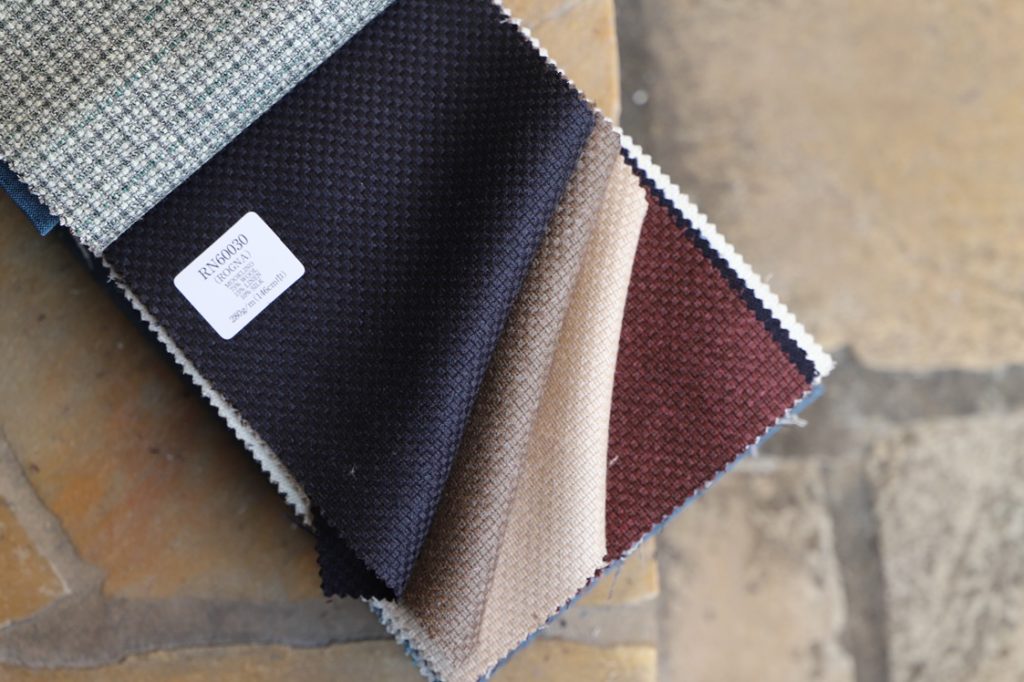 イタリアブランド「ローニャ」のバスケット織が気になるところ。独特な織による表情も素敵ですが、トロっとした肌触りは抜群で、発色もとても綺麗。これは仕立て映えしますヨ。。。