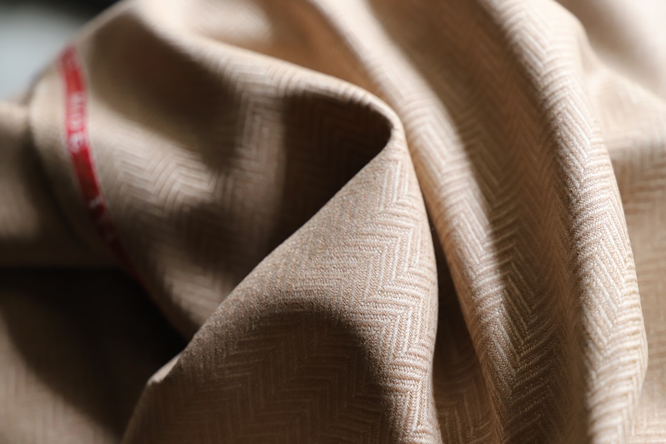 ライトベージュにヘリンボン柄。目付けは320gと軽く、ジャケットに向いております。手触りも良く、暖かい。また、キャメルヘヤーは、吸湿性・発散性にも優れており、常に乾いた状態になろうとする性質がございます。その為、羊毛の二倍ほどの放湿性が。快適な着心地を実現してくれますヨ。