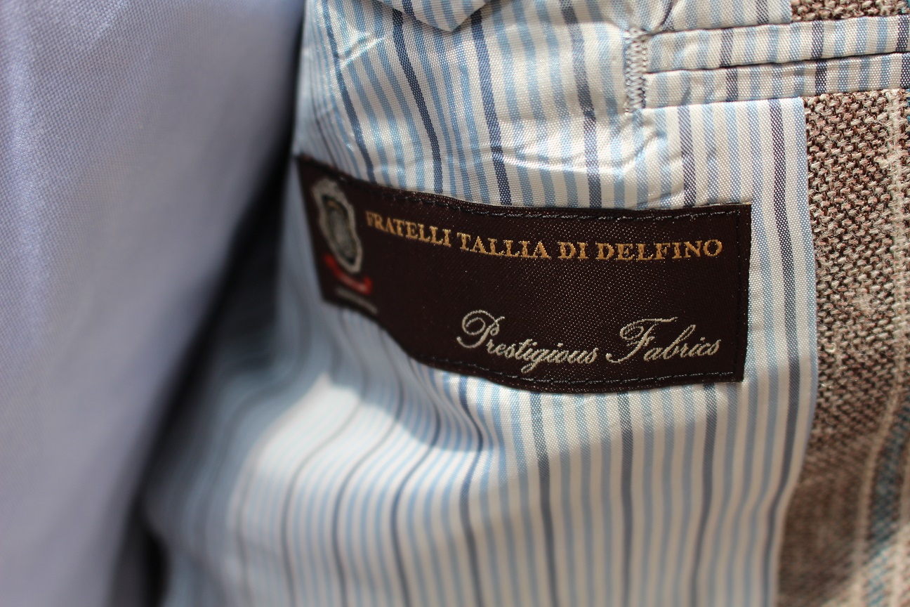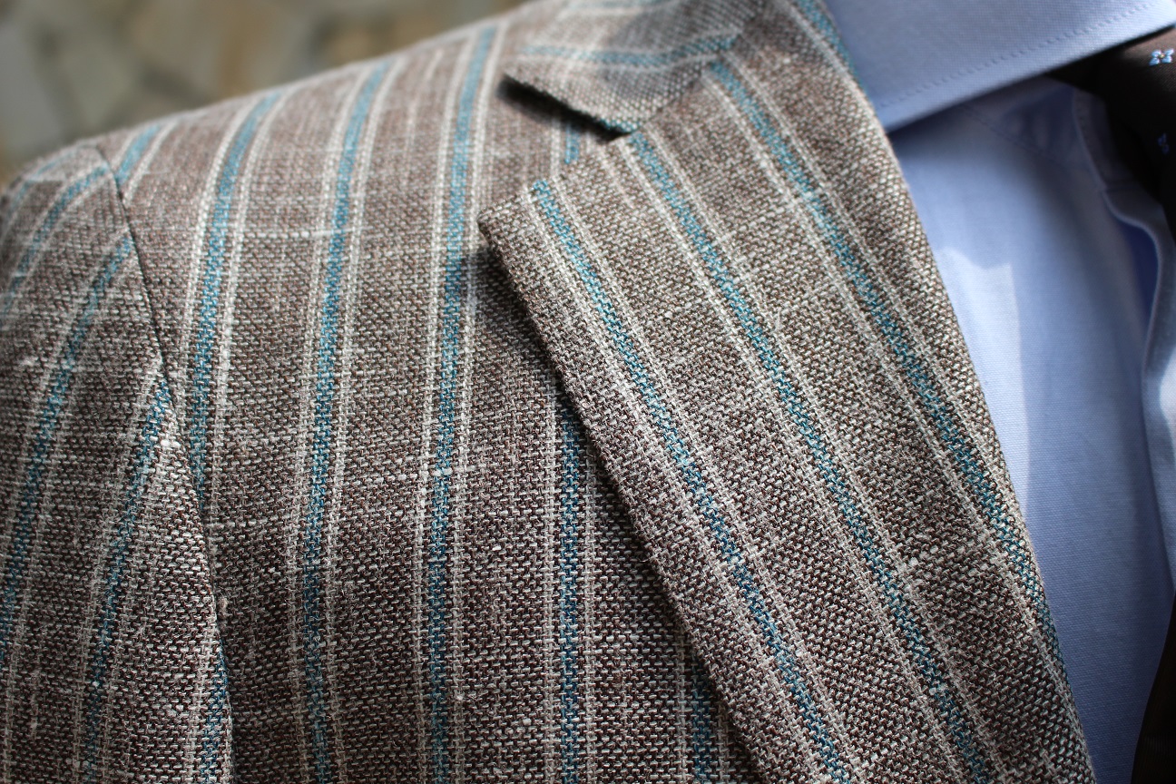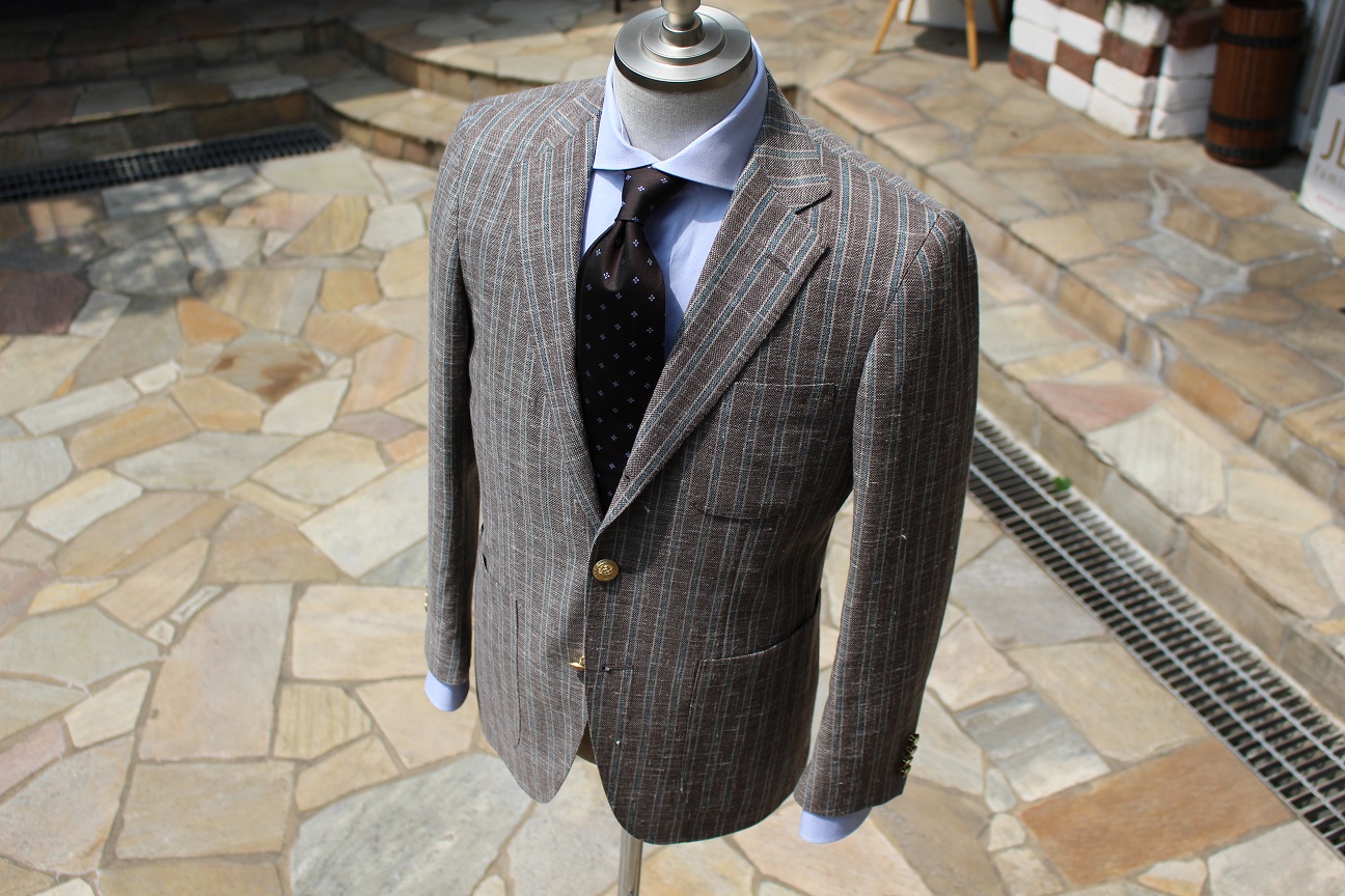リネン、ウール、シルク混紡の服地。それぞれの良さが引き立っております。また、ベージュとミントグリーンの相性の良さに驚き。イタリアブランドらしく、色気のある一着に仕上がりましたヨ。