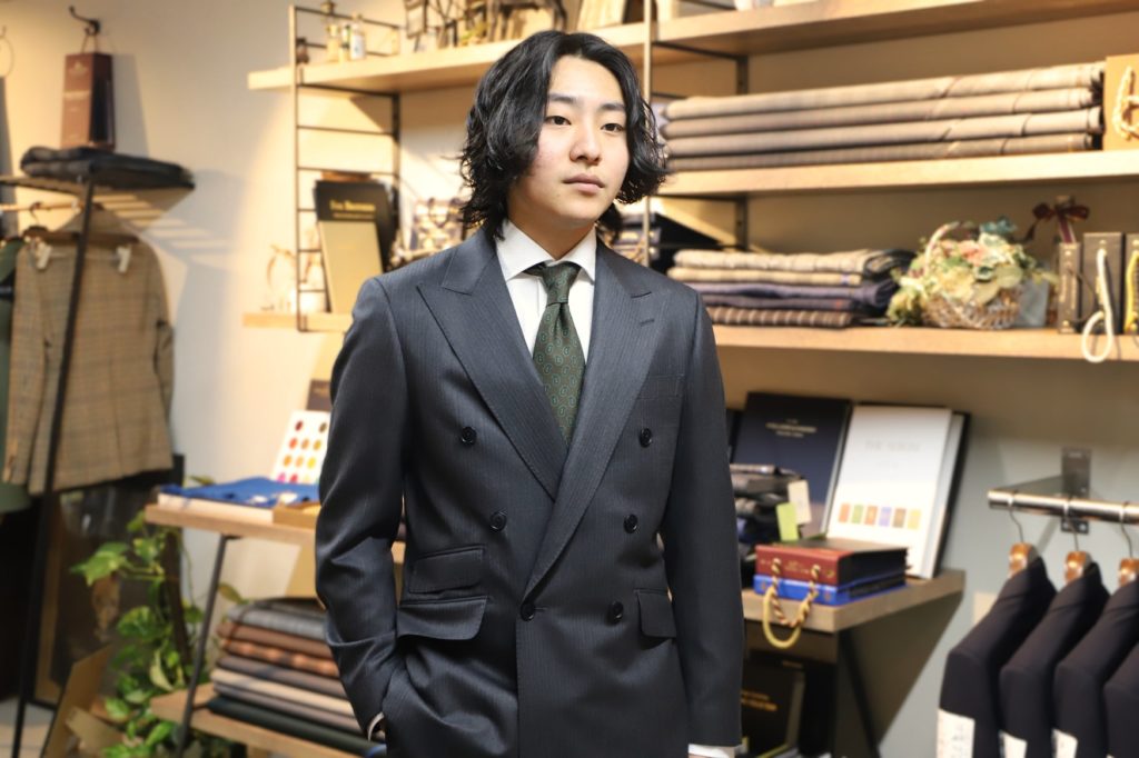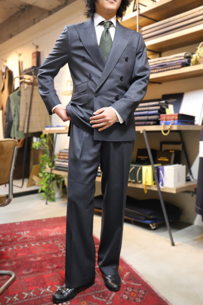 6ボタンのジャケットも、敢えて1掛けにて。ウエスト廻りはある程度絞り、スタイリッシュに。タック入りのパンツは綺麗に落とすことに拘りまして、ワイド目なサイジングにて。