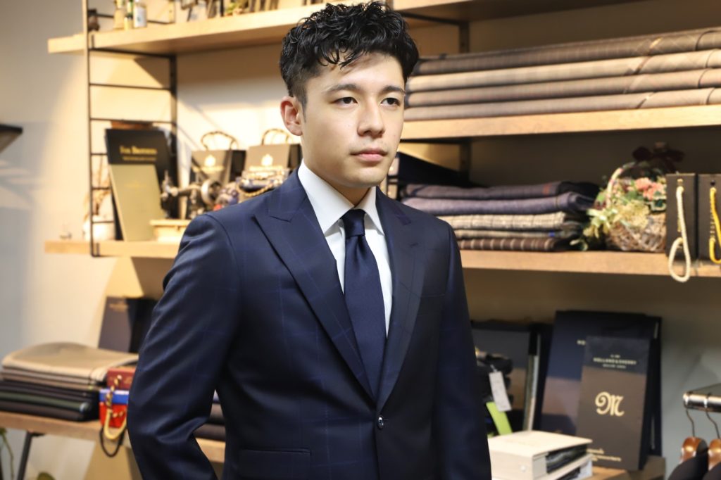 本日のご紹介は、成人式用にてオーダーいただいておりました一着。フランスラグジュアリーブランド「ランバン」のウール&シルクのネイビースーツ。他ブランドでも目にするシャドーチェック柄も、一味違います。爽やかなS様にはとてもお似合いでしたネ。