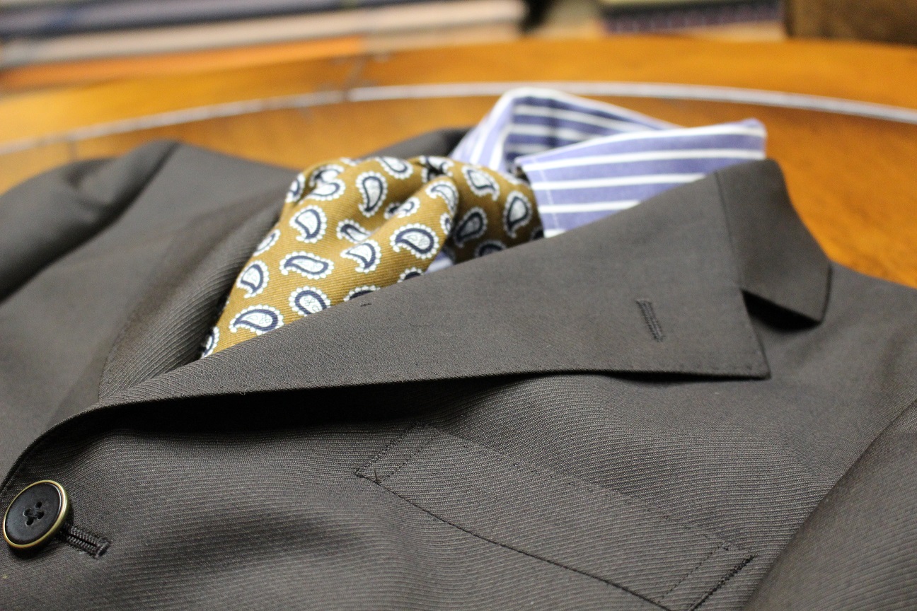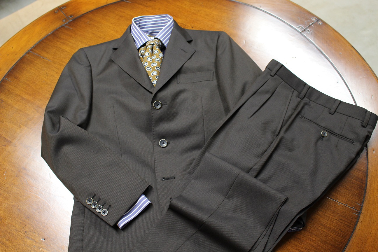 ブラウンという事もあり、さらにビンテージな雰囲気が高まっておりますネ。パンツもワイド目なツータック。着用シーンを拝見するのが楽しみです。スーツが無地なので、シャツ、ネクタイで如何様にもアレンジできるのも良いですネ。