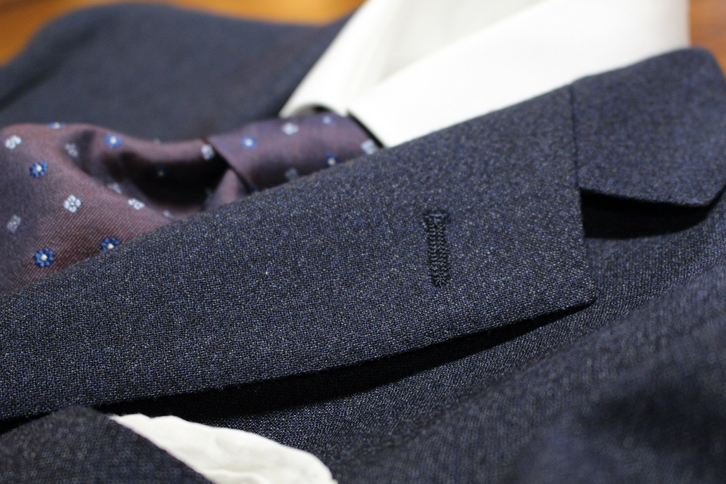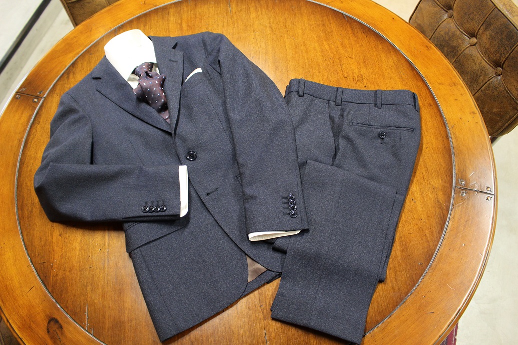 霜降り調な服地。複数の糸色をミックスさせ独特な表情を見せております。柔らかい、スポーティーな印象。カッチリとしたスーツというよりは、カジュアルなスーツ。でしょうか。