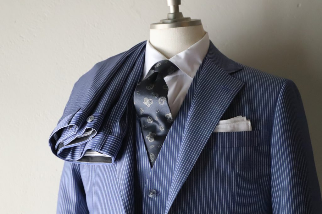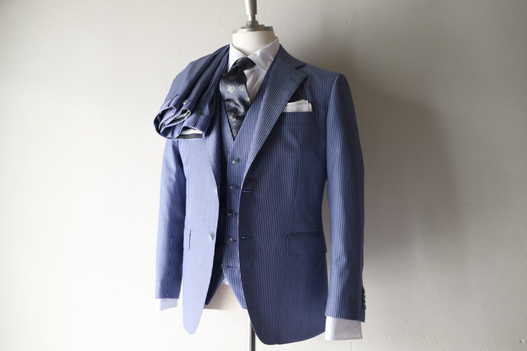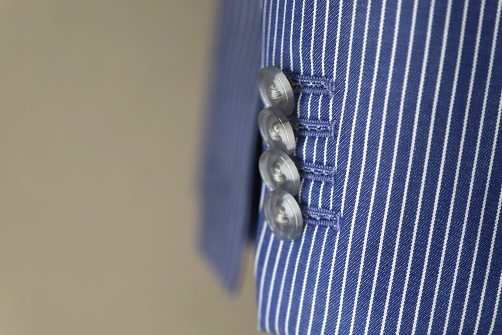 ナポリの名門アリストンのスリーピース。ブルーベースに白ストライプ。注目はラインのピッチ。この幅で、ここまではっきりと入っている生地は中々ございませんヨ。