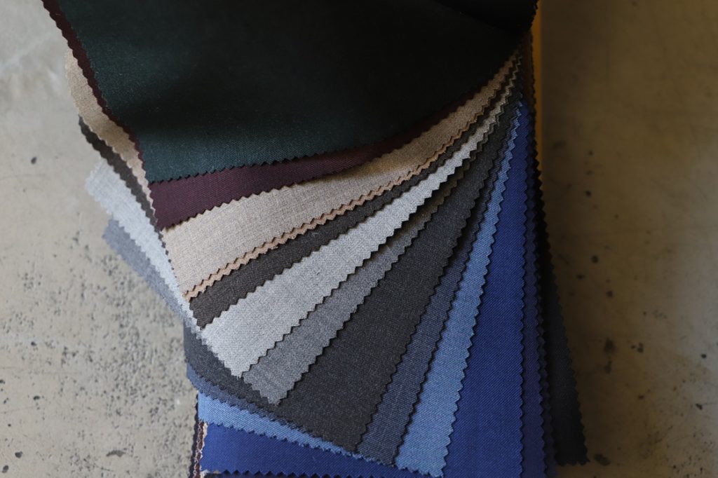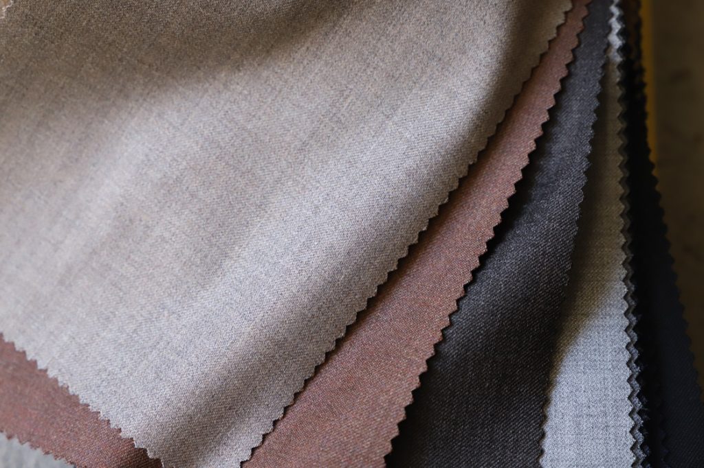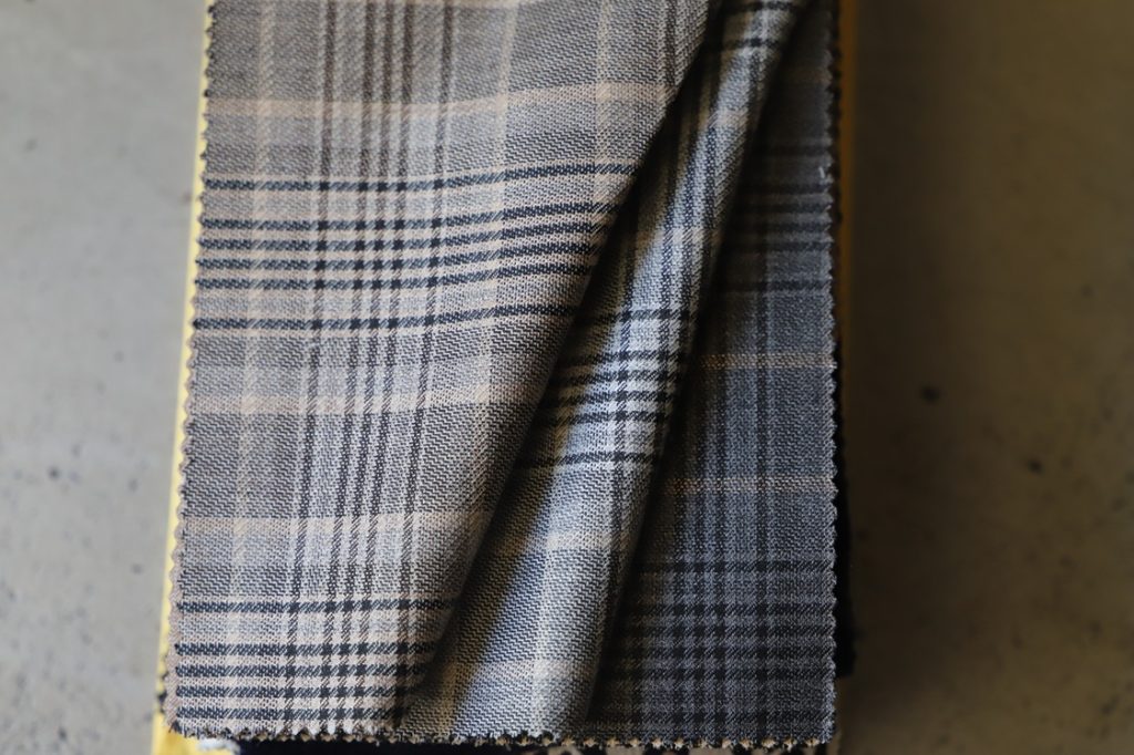 ウール・ビスコース・エラスタンの三者混。ビスコースによる美しい光沢はシルクを思わせる程に美しい。また、エラスタンのスーパーストレッチ機能は驚異的。ウール生地では実現できない伸びがございます。