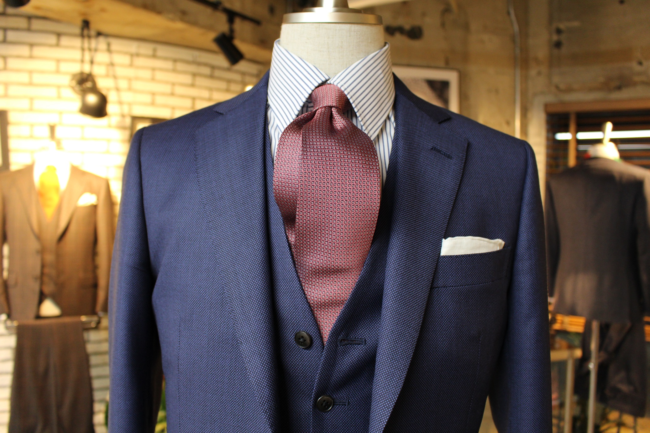 スリーピースなので、華やかさもあり、ワインレッドの裏地もオーダーならではの仕様です。