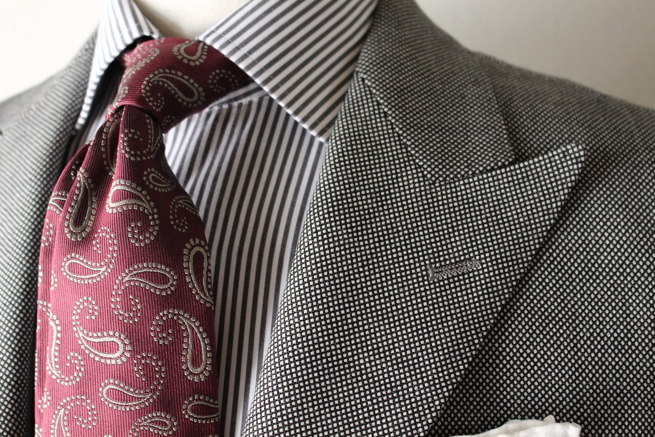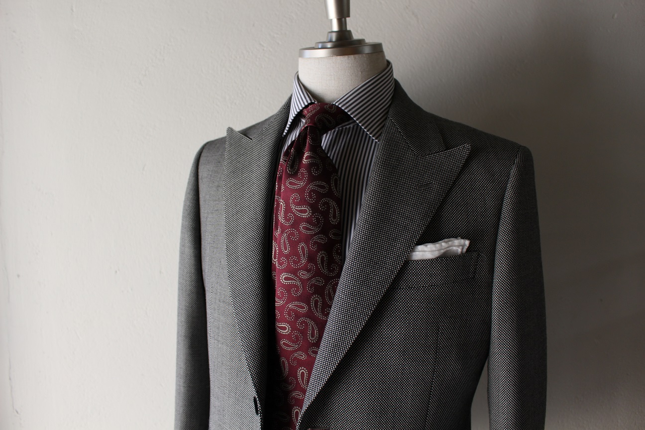 最近ではあまり見る事も少なくなっていた白×黒のバーズアイ柄。ネイビーや、チャコールグレーなどの無地調な服地は定番でございましたが、、、ここまで大柄のバーズアイは珍しい。着こなしにもよりますが、このスーツ、クラシカルな雰囲気が漂います。ピークドラペルがさらにそれを引き立てますネ。裏地は敢えてポップに。大柄のドット柄をチョイス。今風な要素を注入です。