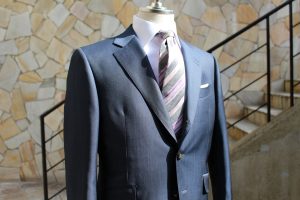 少し緑がかったグレーに、ブラウンのブークレ糸を使ったウィンドウペン。ヴィンテージな雰囲気が漂います。イタリア系ミルが得意とするデザイン性溢れる服地です。これを国内メーカーが生産いたしまして、リーズナブルなプライスにてご提案させていただいております。今回はダブルベストもオーダーいただき、よりクラシカルな仕上がりになりました。拘りが感じられますネ。