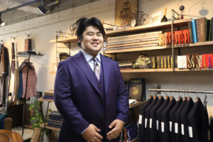 一見、チェック柄でピークドラペルと、貫禄のある英国スタイルに感じますが、肩先は柔らかくイタリアン寄りに仕上げました。まさに今人気のミックススタイル。着心地は軽く楽に感じますが、見た目はキッチリ!とてもお似合いでしたネ。