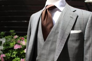 本日はモヘヤの光沢が美しい、ブルーグレーのスーツをご紹介。太陽の光が当たると、より一層モヘヤの良さが際立ちます。
