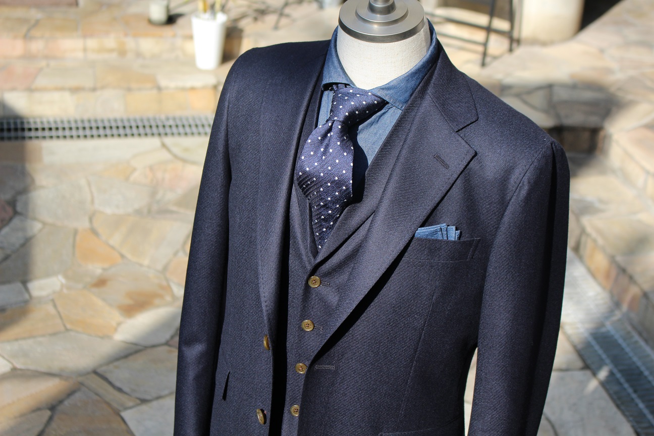 お写真から伝わります。フランネルでありながら、この美しいドレープには思わずうっとり。ご友人の結婚式用にてオーダーいただいた一着。襟付きのベストで華やかさをプラス。蝶ネクタイを合わせても良、可愛らしくきまりますヨ。オフには、セットアップでカジュアルに着こなしていただける事でしょう。
