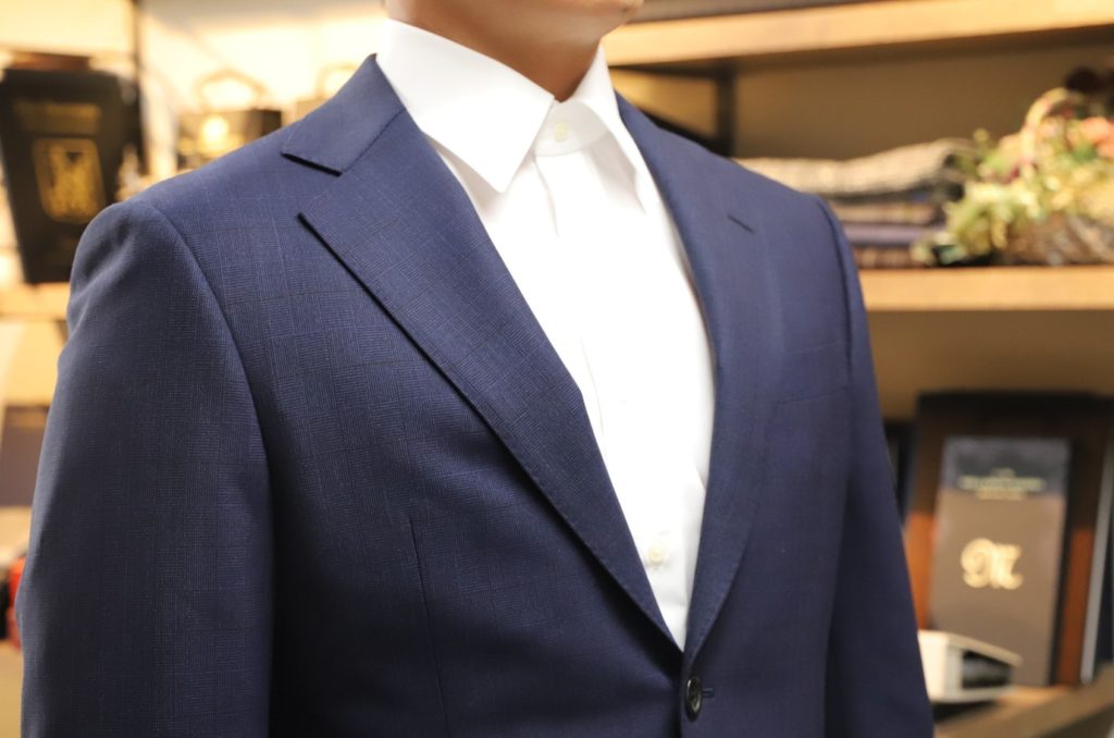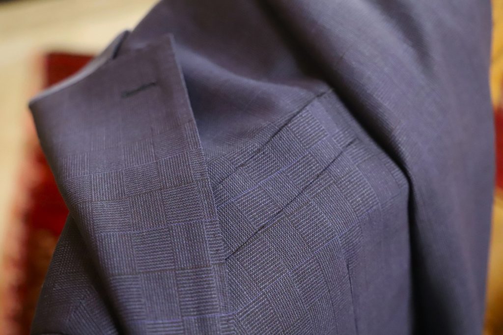仕立て上がりはご覧の通り、パリッと美しく、貫禄を感じさせる。本日ご紹介の柄行きは独特で、少し和のテイストが入っているかのよう。当目には落ち着きのあるブルーグレーとなっております。