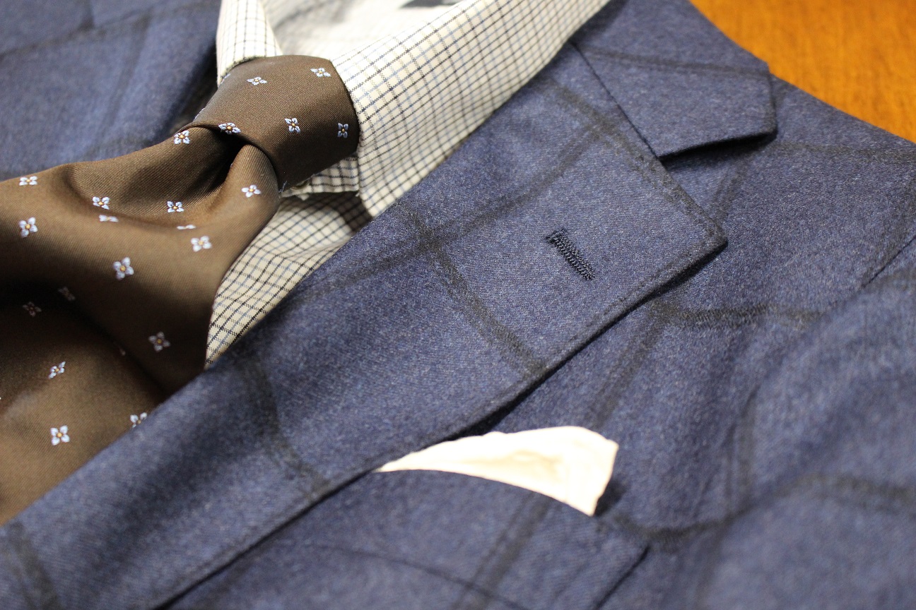 ブルー系ベースにウィンドウペンの柄行き。黒のラインなので、目立ち過ぎず程よい主張具合に。カノニコ社のフランネル、この生地感でドレープもしっかりとございます。もちろん、肌触りも申し分なく、気持ちいいんですッ。こういった季節感のある服地は、カジュアルでも、セパレートでもご着用出来ます。冬しか着用出来ないから、、、と、中々手が伸びない方、実はコスパ抜群の服地なんですヨ。