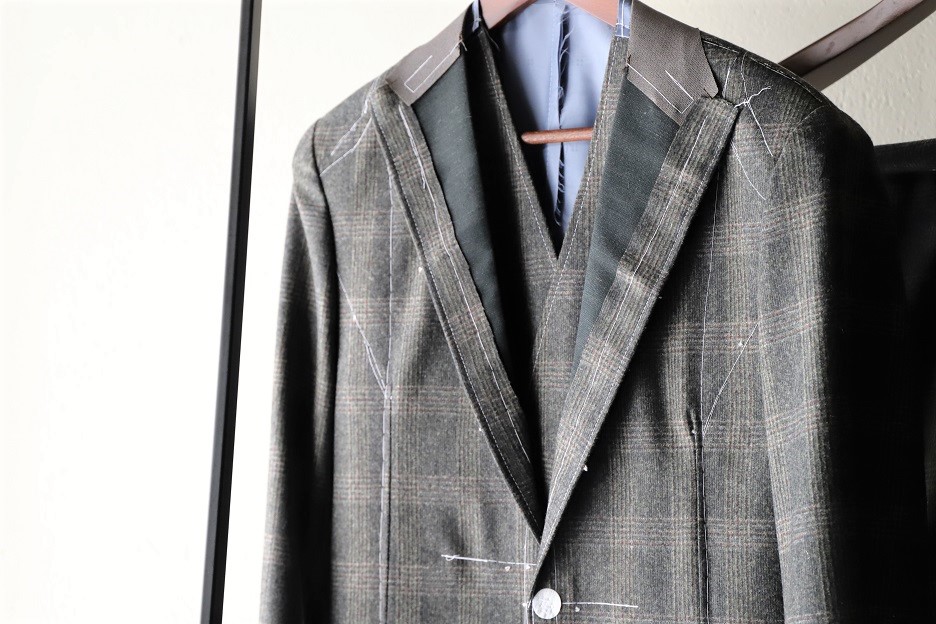 今回はカノニコ社のグリーンフランネルの生地にて仮縫い。お洒落度が高い。独特な雰囲気。。