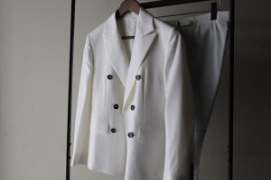 モヘヤクアトロのコレクション、イタリア生地にしては珍しく、ジャリッとしたハリコシのある服地。仕立て上がりもパリッとした印象に。少し英国生地よりな感じですネ。