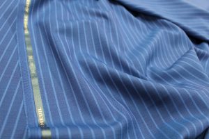 表面を敢えて粗目な織に見せる加工が施されており、軽快でお洒落な印象を与えてくれます。今回はパーティースーツでのご注文でしたが、ビジネスでも問題なく使っていただけるかと。定番の無地からチェック、ストライプまで、色柄も多数取り揃えております。