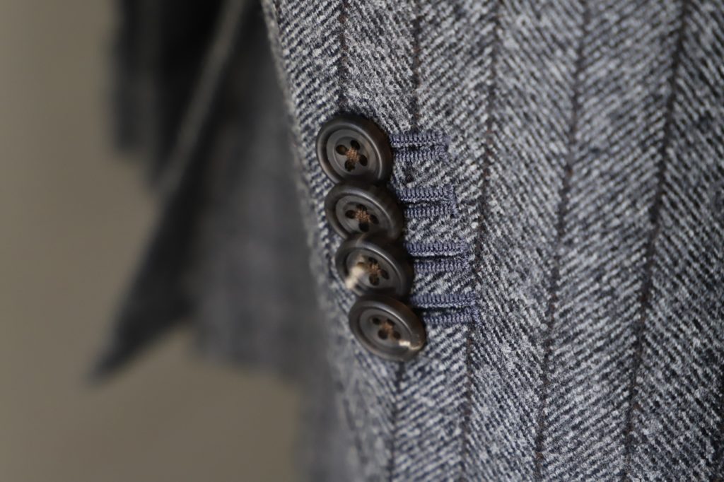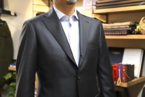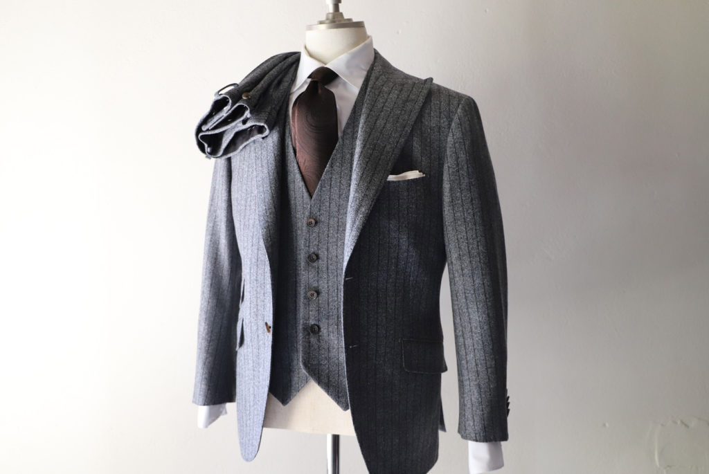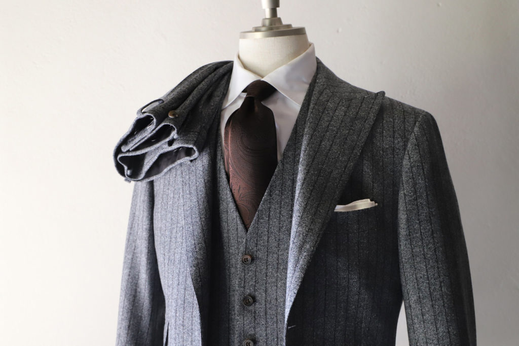 ミディアムグレーのヘリンボン柄にストライプを掛け合わせた柄行き。実にクラシックな印象。インナーにはニットのハイネックなどを合わせても良さそうですネ。