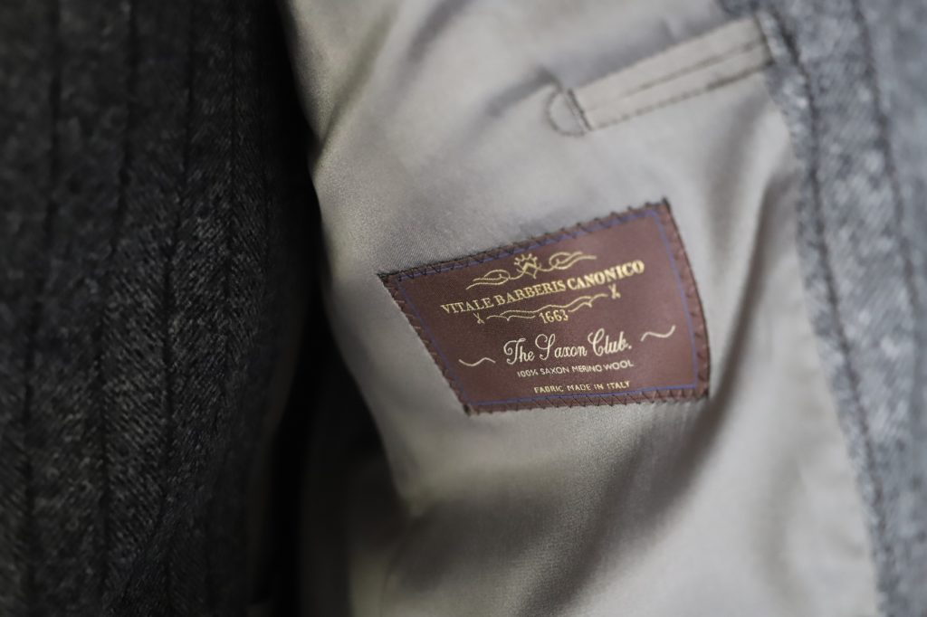 本日のご紹介は、カノニコの豊富なコレクションの中でもハイクオリティに分類されるサクソンメリノウールを使用した一着。希少なサクソン種の羊から取れるウール(毛)は、繊維が細く仕上がりもふっくらと温かみがございます。また、クリンプ(繊維の縮れ)が強く、弾力が非常にございまして、ご覧のような立体感を実現しております。