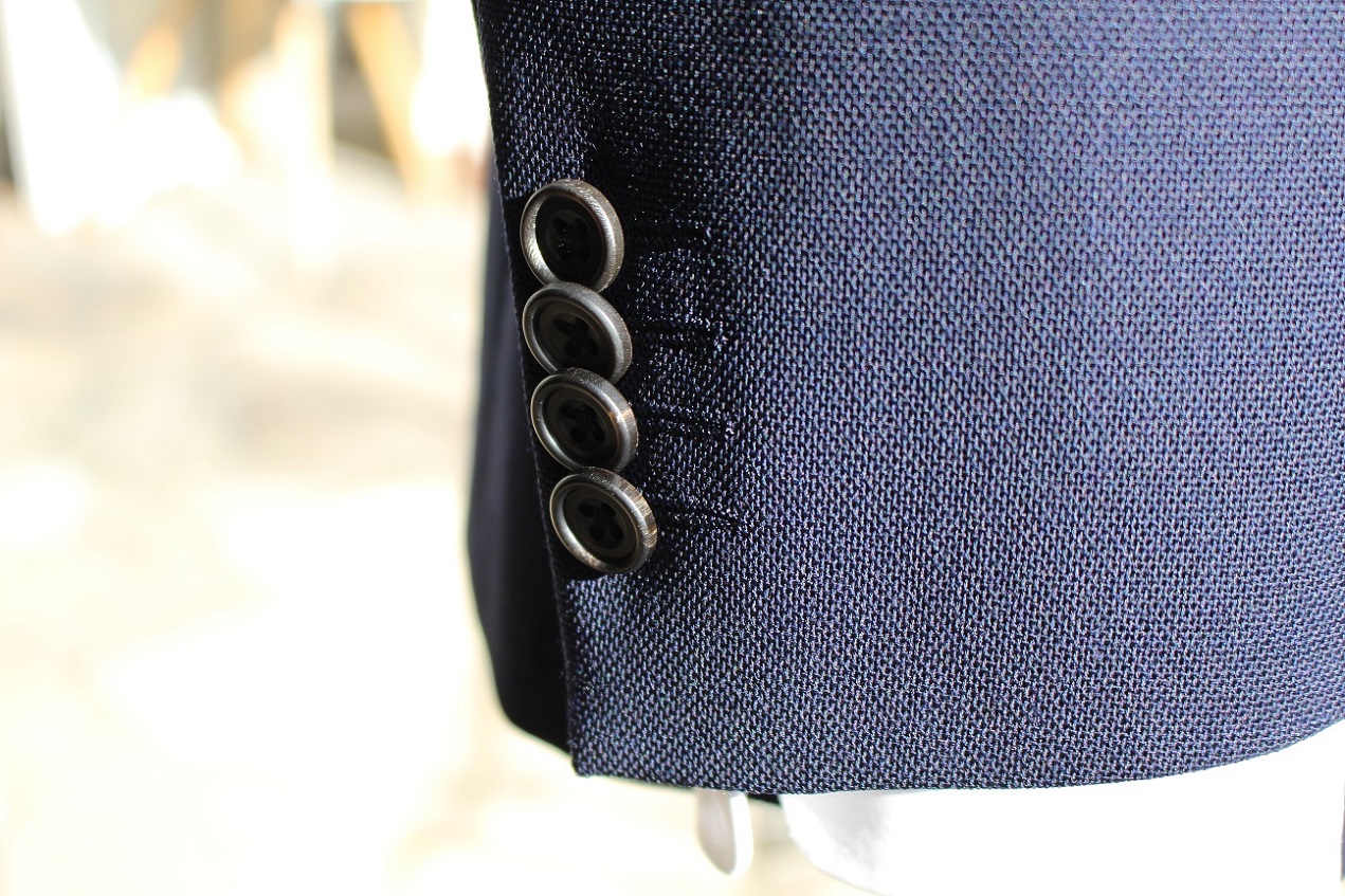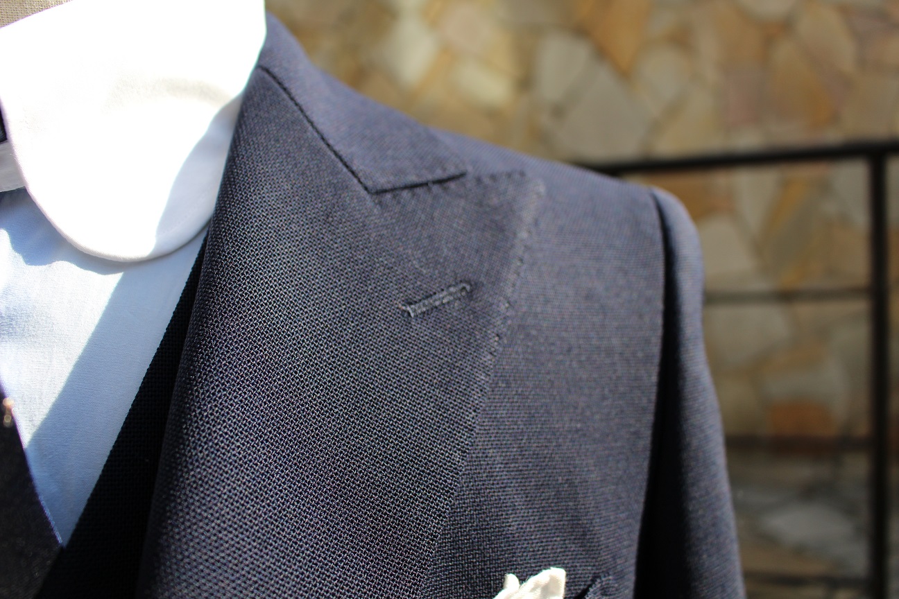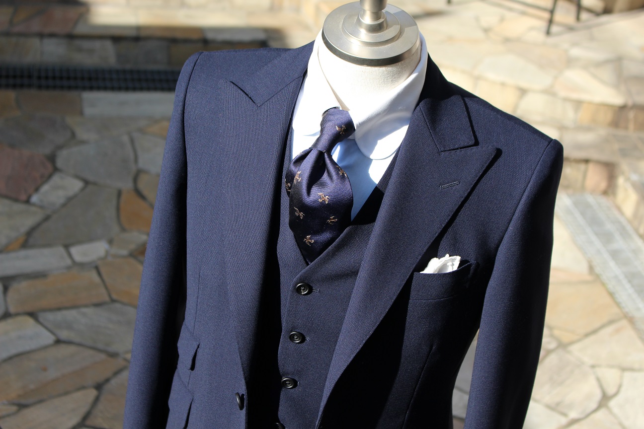一見定番のネイビースーツ。よく見ると分かるシックスプライの目の粗さ。ジャリっとした肌触り。生地の落ち感はとてつもない。丈夫さは言うまでもなく、「最強スーツ」なんて事が業界では言われております。