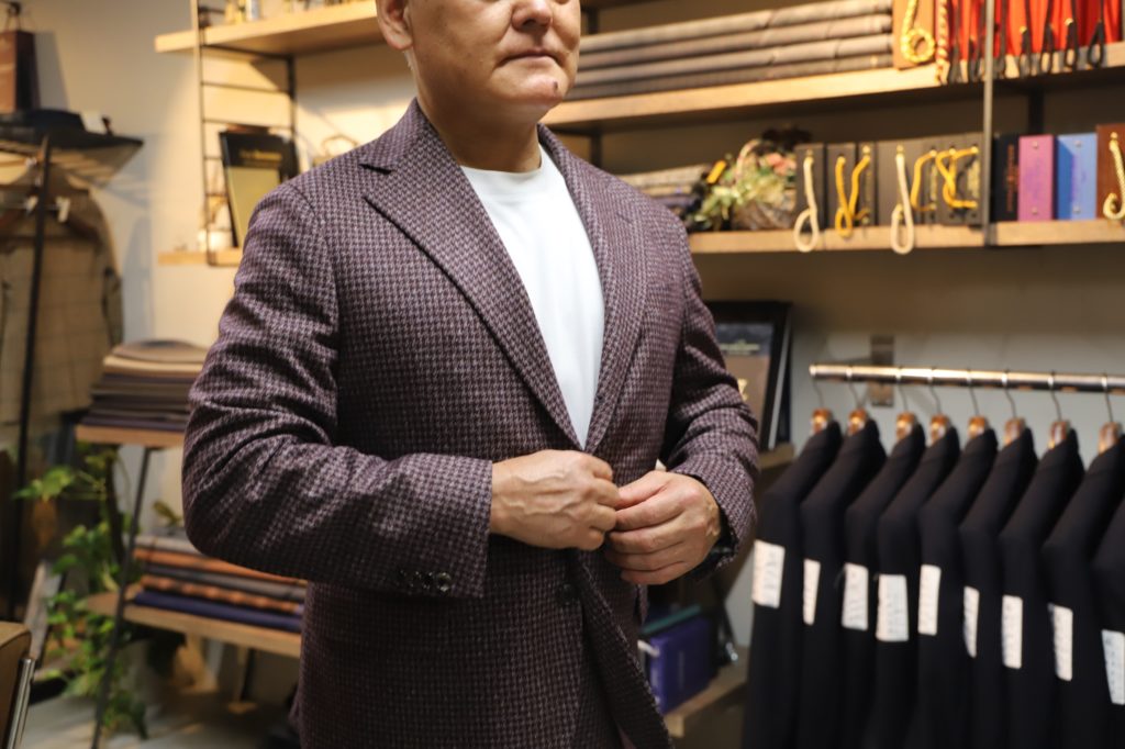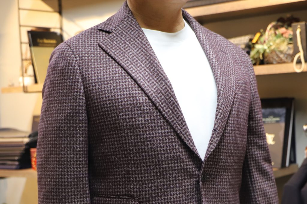 本日は素敵なセットアップのご紹介を。カノニコ社、ウール&シルクのジャージー生地を使用。非常に珍しいワインレッドのハウンドトゥース柄ですヨ。