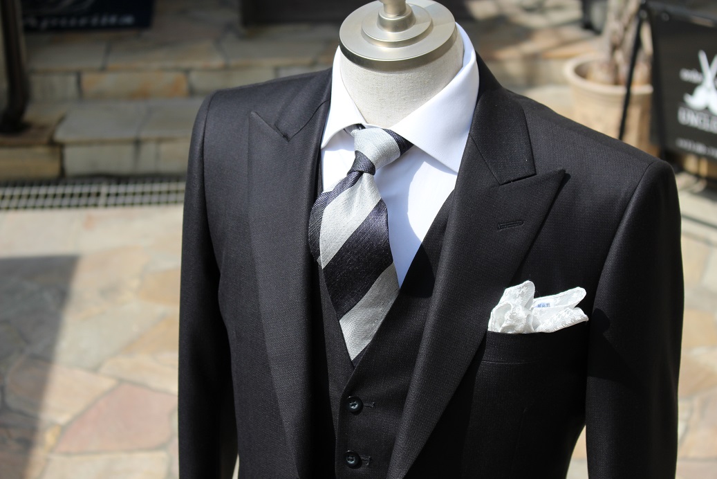 さてさて、本日も素敵なオーダースーツのご紹介を。本日はブラックのドレッシーな一着。シルク混紡の美しいスーツ。
