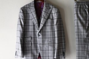 本日のご紹介は、本場英国生地による、英国柄のブリティッシュスーツ。ハリコシのある生地感で、仕立て上がりも美しい。重厚感が伝わってきます。ドット柄裏地というのも、さらにムードを高めておりますネ。