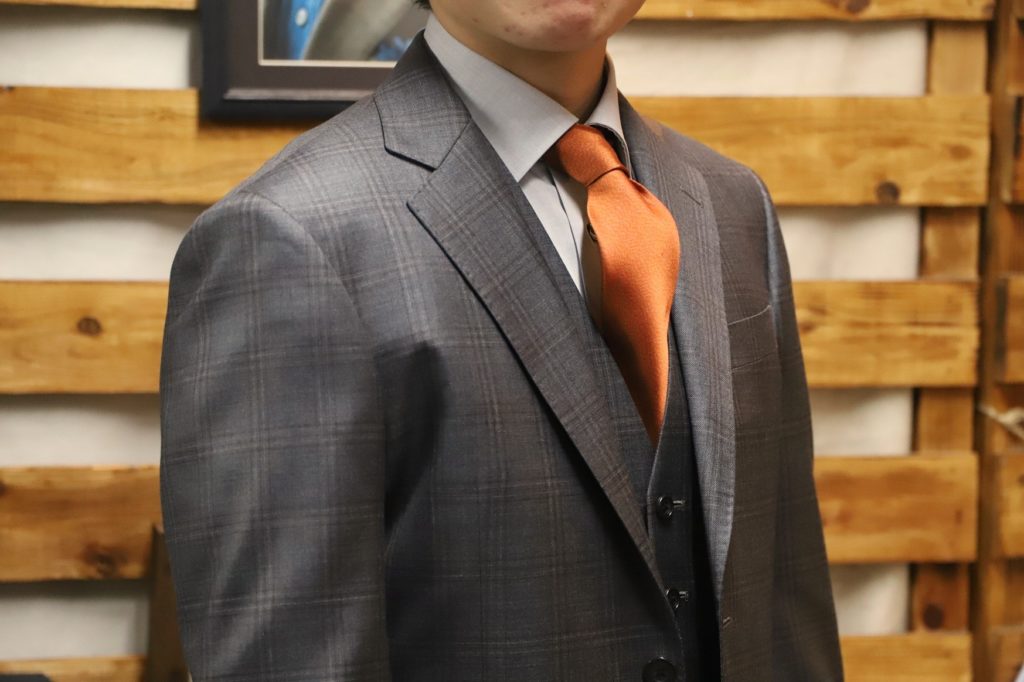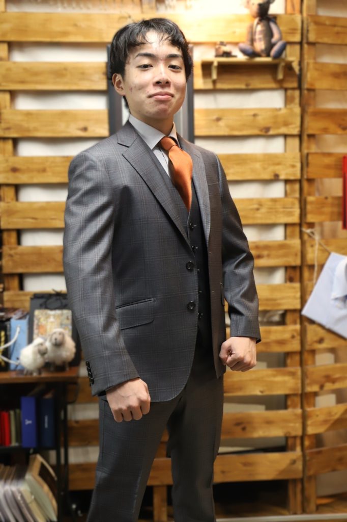 本日は、成人式用にてオーダーいただいておりましたスリーピースのご紹介。M様、この度は誠にありがとうございました。ネクタイやドレスシャツも合わせてオーダー。グレーベースのコーデに、華のあるオレンジのネクタイを合わせました。良いアクセントになりましたネ。
