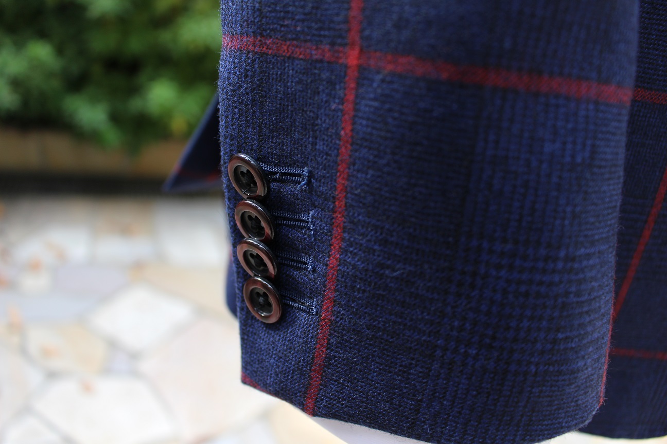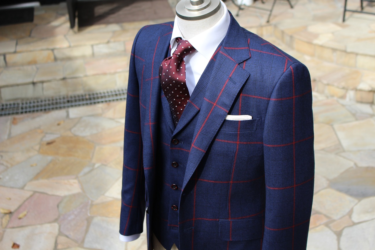 赤のオーバーペーンが特徴的なスーツです。釦、裏地では赤を程よく拾い、全体的にバラつかないよう合わせるのがミソ。今回は白シャツを選びましたが、細かいチェック柄のシャツなんかでも面白いのではないでしょうか。柄の大きささえ変えてあげれば上手くまとまりますヨ。