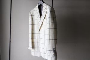 中々既製品では見かける事のないダブルブレスト。オーダーいただく機会が少しずつ増えてきたように感じます。今回のご紹介。生地の色柄やコーディネートも相まって、ブリティッシュな印象に仕上がりました。ライナーにはワインの市松。ビジネスなどで、派手な裏地はちょっと。なんて方でも、ダブルは裏地が見える機会が少ない為、遊び心を加えても良いのではないでしょうか。