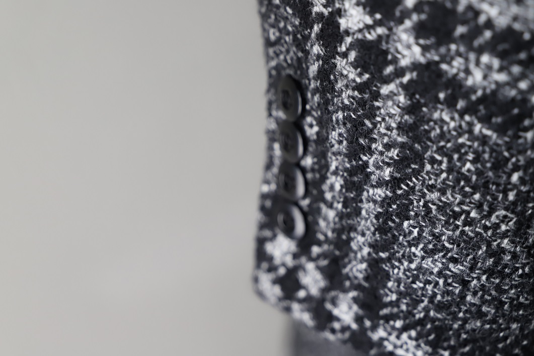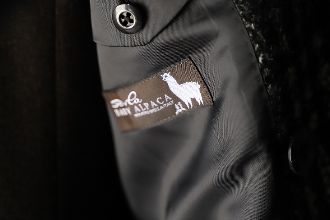 イタリアブランド、フェルラの生地を使用。ウールに加え、希少価値の高い、ベービーアルパカを40%以上混紡しております。ベビーアルパカの毛は、細く、柔らかく、カシミヤに似ておりますが、丈夫さがあり、保温性が抜群です。ウールの8倍の保温性とも言われております。先に申し上げましたとおり、カシミヤに似ているところもあり、滑らかで、肌触りも抜群です。見た目以上にトロッとしておりますヨ。