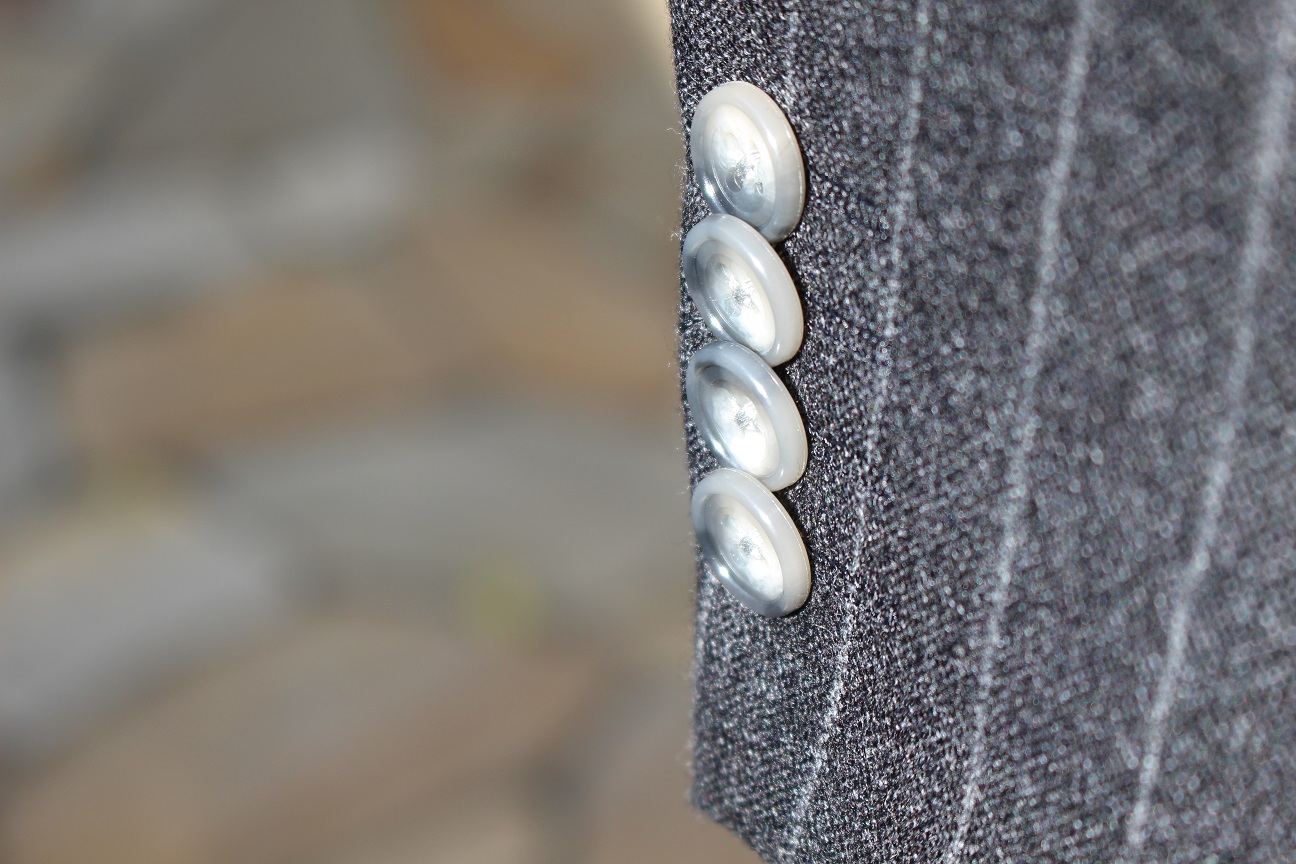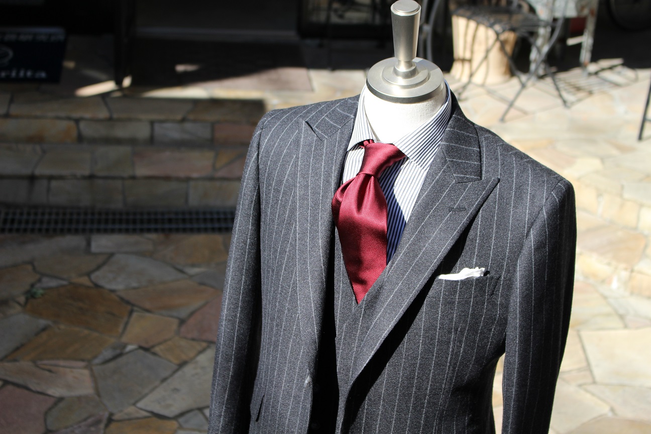 グレーフランネルのチョークストライプ。ピークドラペルにダブルベスト。クラシカルなスタイルに。個人的には、フランネルスーツとしては、これくらいはっきりとしたラインが好き。英国紳士な雰囲気が漂いますよ。ボルドーカラーでまとめるとさらにそれっぽくなりますネ。