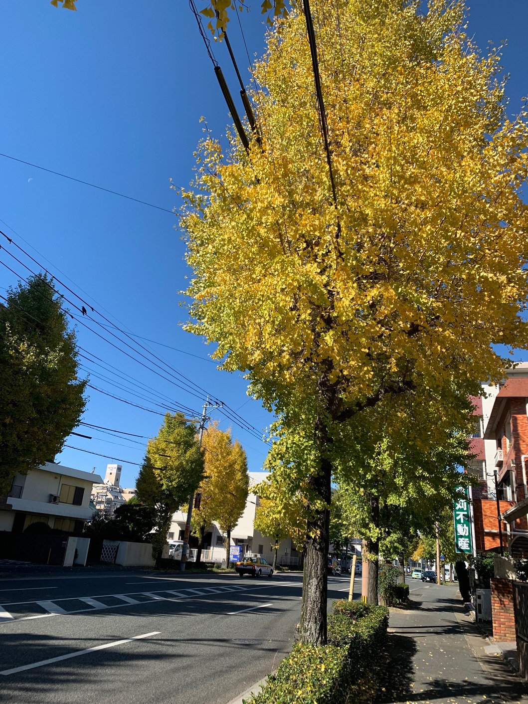 気持ちの良い青空に、綺麗な紅葉。思わずパシャリ。電線が突き刺さっておりますが、それもまた芸術的な良いアクセントと思っていただけれますと、、、