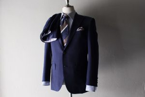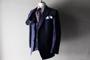 業界人からも高い評価を受けている、英国フレスコ生地。このようなスーツを着用されていらっしゃる方を見ると、自然と視線を向けてしまいます。仕立て上がりの美しさはご覧の通り抜群でして、他の方と、分かり易く差をつける事も出来ますヨ。