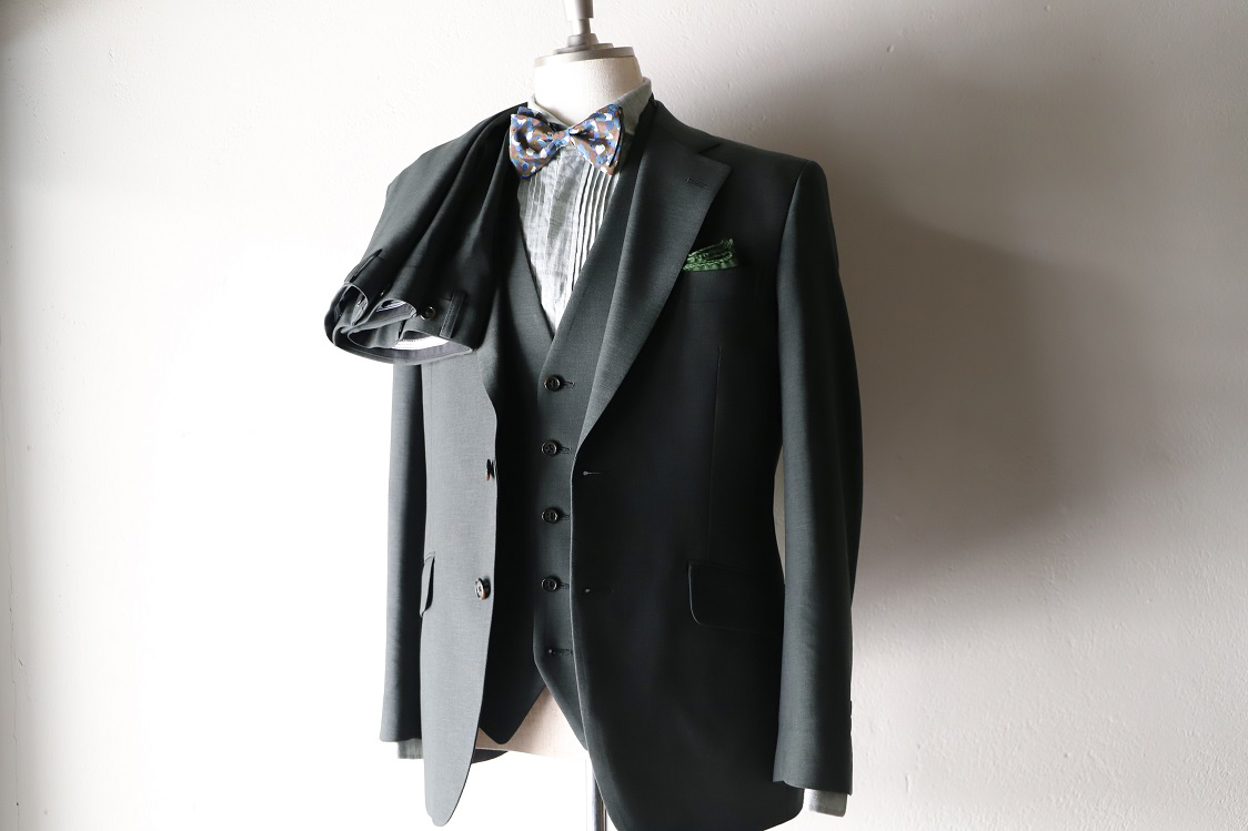 本日のご紹介は、グリーンカラーのスリーピース。これはパーティーシーンにも活躍する事間違いなし。