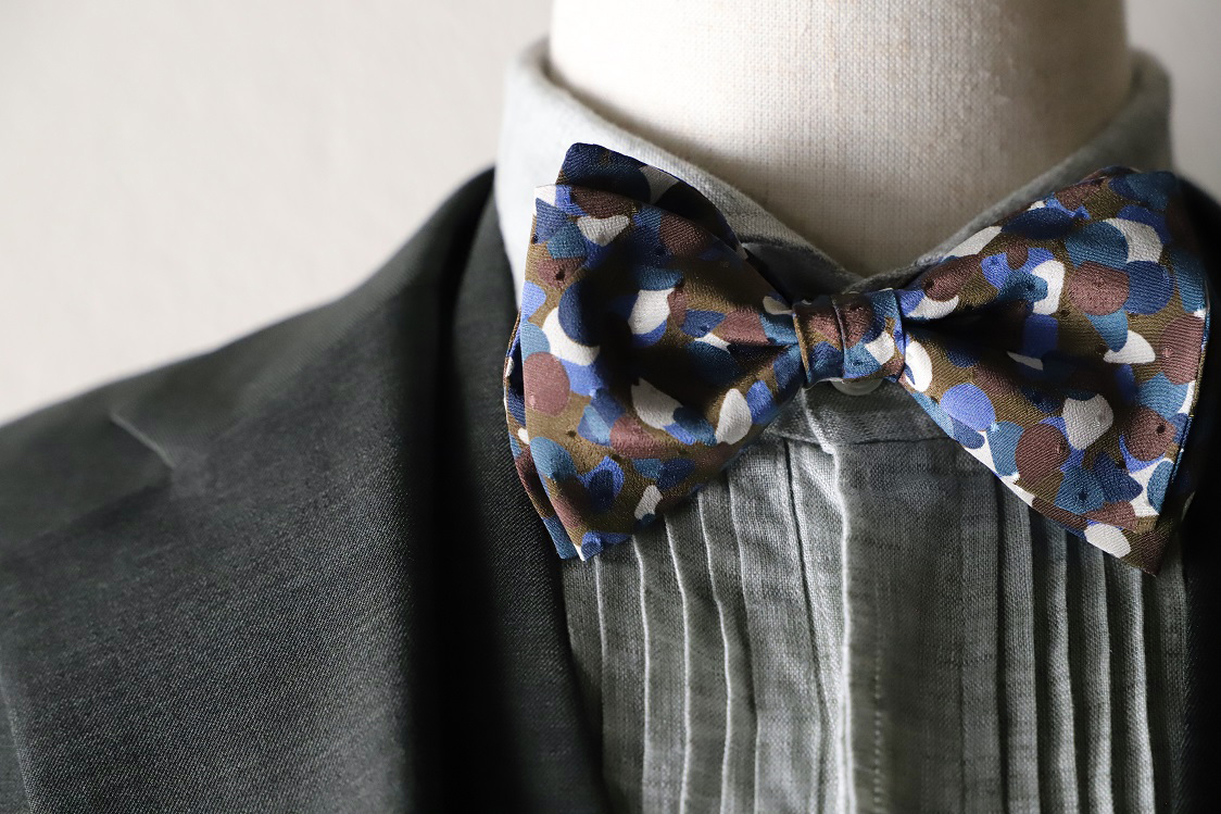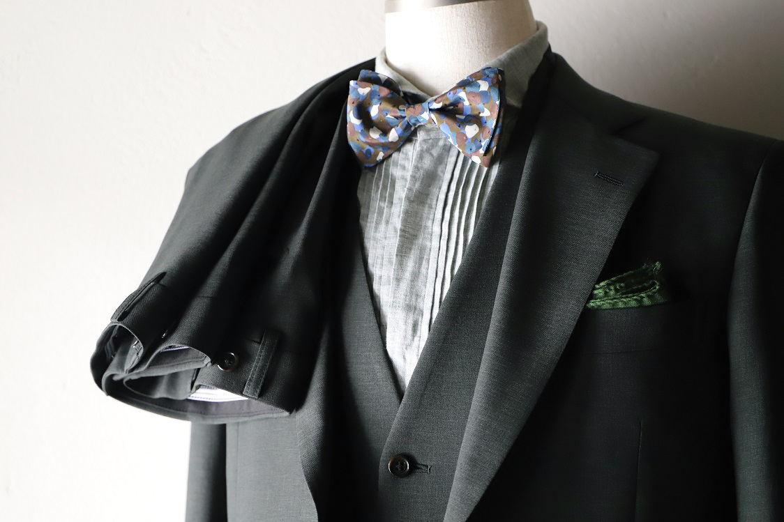 渋めなダークグリーン。コーディネート次第ではビジネス、パーティー、どちらにも化けそうな1着かと。ご紹介は、リネンの淡いグリーンシャツにプリントの蝶ネクタイ。