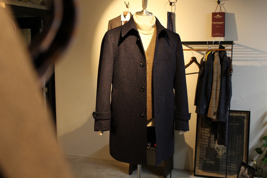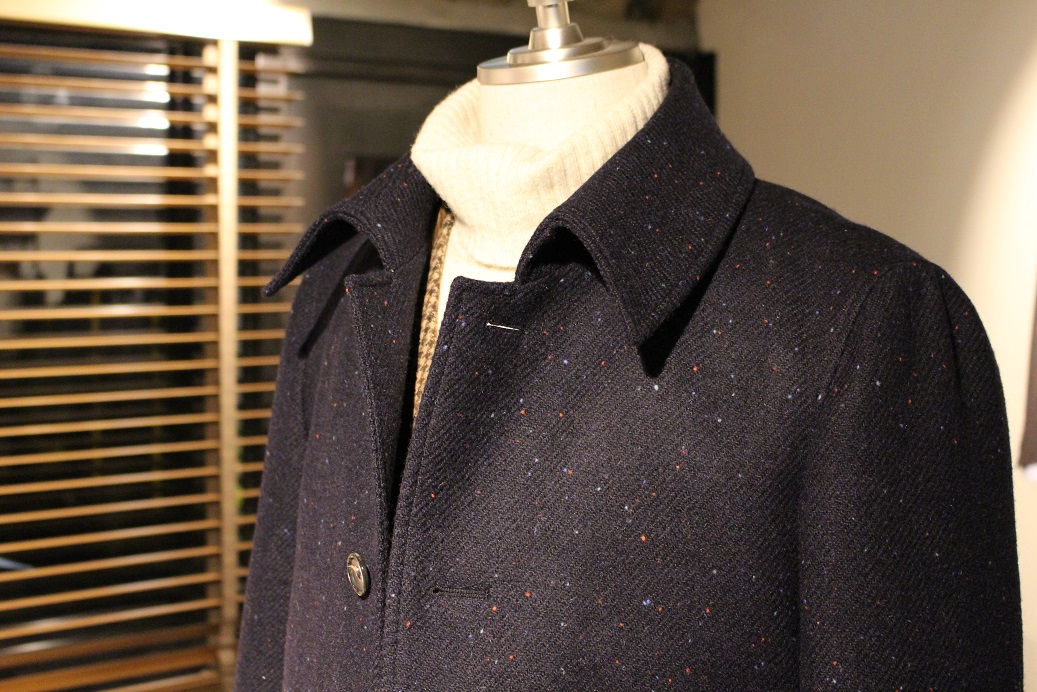 本日はステンカラーコートのご紹介。暖かみのあるツイードの服地を使用。ネップの入ったネイビー生地。オンオフ兼用でご着用いただける絶妙なラインかと。