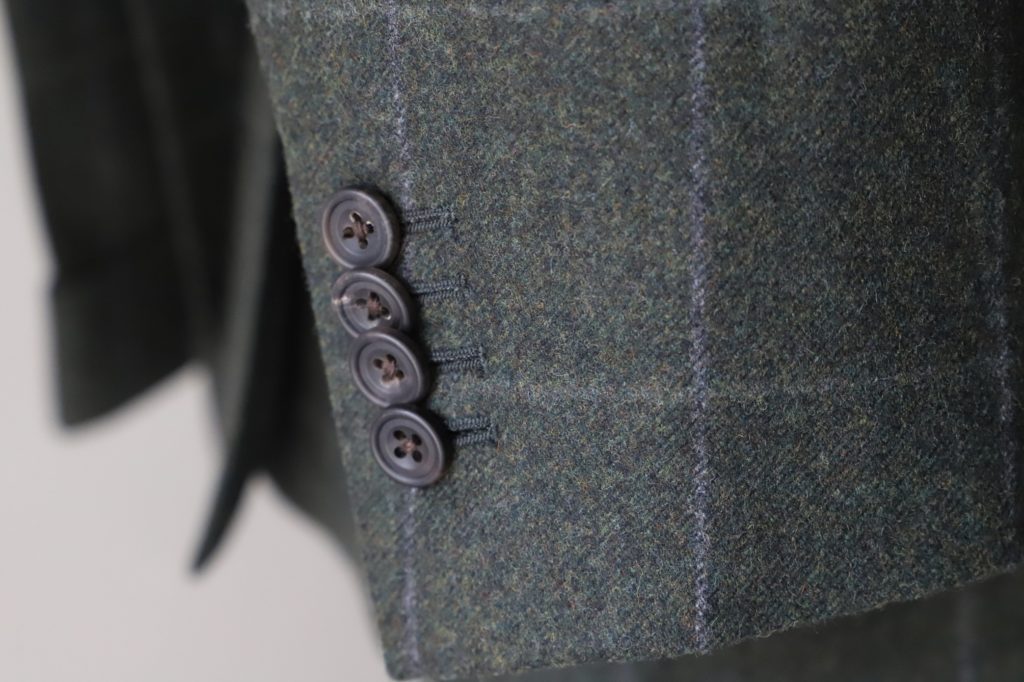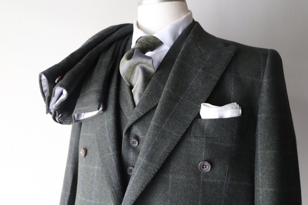 本日のご紹介は、ハリソンズのフランネルコレクションより、ダブルブレストのスリーピース。グリーンカラー、ウィンドウぺン柄にてオーダーいただきました。K様、いつもオーダーいただき、誠にありがとうございます。