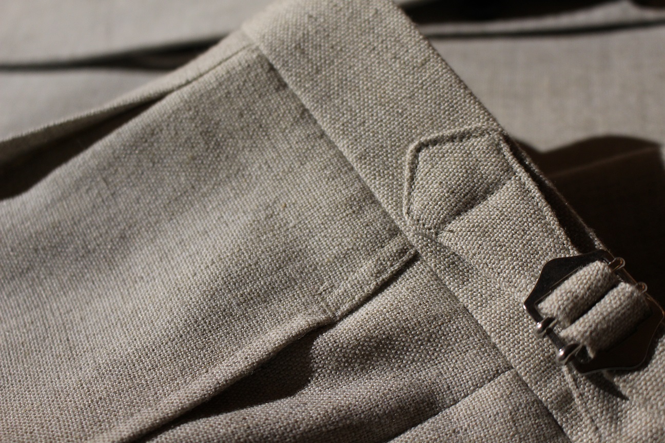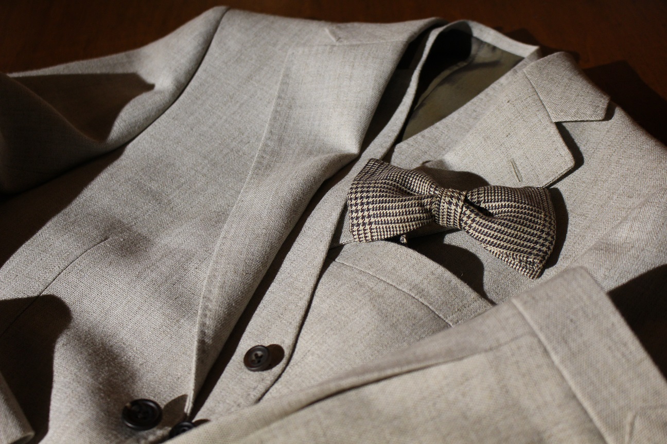 さてさて、本日も素敵なオーダースーツのご紹介を。海外での挙式用にてオーダーいただいた一着。南国らしい、季節感のある素材を使用。蝶ネクタイにもリネン生地の可愛らしいチェック柄、ハンドメイドで仕上げました。