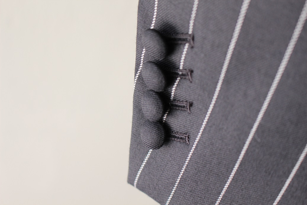ダブルブレスト、フロントカットにはラウンドを。ボタン位置等高めに設定。ボタンは当然くるみボタンで。貫禄のモッズ。。