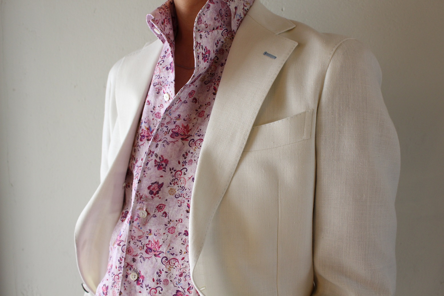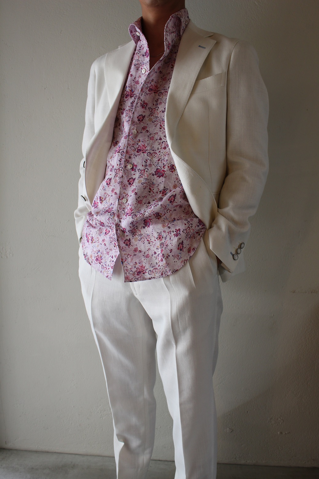 リネン×テリレンのシーシェル。夏用の服地として、当店では、毎年人気のあるコレクションとなっております。リネン混の服地にしては、ハリ、コシがございまして、見た目もご覧の通り美しい。今回はホワイトのお色味にてオーダー。リッチなムード漂いますネ。セットアップで、これを着こなすのは至難の業、個人的には勇気が要りますが、、、H様であれば上手く着こなしていただけるかと。シャツはレジウノのフルオーダー。個性的で素敵ですッ。