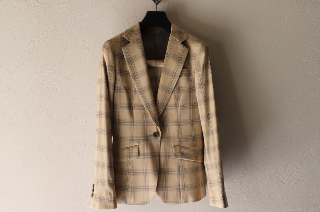 ウール&ビスコースの光沢のあるベージュチェック柄、ゼニアのテラコッタカラーのセットアップ。どちらも既製品ではまず手に入らないスーツかと。ジャガードの特殊裏地も拘りポイント。