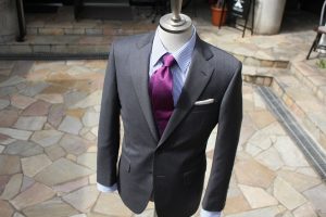 フランスブランドらしく、気品のある美しい服地。夏場でも、涼しく、気持ちよく、この気品を纏う事が出来ます。いつかのブログでもご紹介しておりました、ランバンの超軽量服地。目付も150gを切るほど。心配なのがパンツの透けなのですが、そこのトコロも対処済み。この軽さ、薄さで透けにくい。安心してご着用出来ますネ。シルク混なので、丈夫さも織り込み済み。