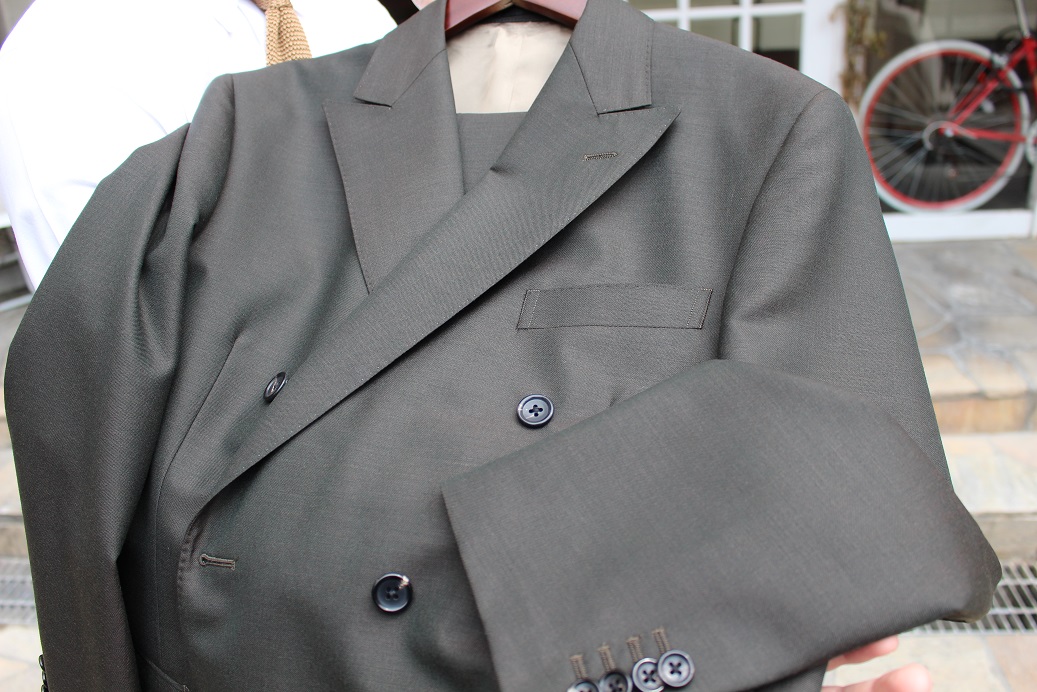 T様、いつもありがとうございます。今回はダブルブレストにてオーダー。カーキのお色目でも、モヘヤが入る事で暑苦しさを感じさせません。実際に着用時も少しひんやりしたり。